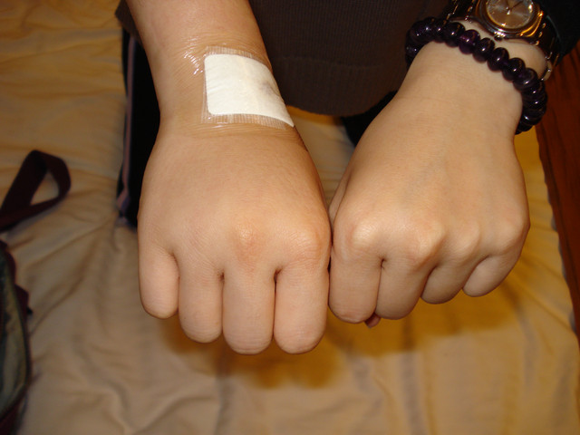 一開始,先將我的右手上臂處綁上止血帶,很像量血壓的那種充氣裝置